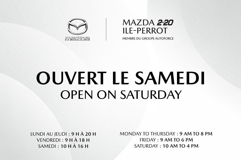 Bien équipé! FAITES VITE, inspection disponible! Opportunités de financement toujours disponible! Well equipped! ACT NOW, inspection available! Financing opportunities always available. Inspecté par nos techniciens certifiés Inspected by our certified technicians. Certified Mazda Dealership in Ile-Perrot, member of Group Autoforce. Wide variety of used vehicles are available for sale with the best prices in t he region of Montreal - Pointe-Claire - Dollard-Des-Ormeaux - Pierrefonds - Roxboro - Kirkland - Beaconsfield - Baie D'Urfé –Senneville - Sainte-Anne-de-Bellevue - Dorval - Longueuil - Ville St-Laurent - Lachine - Lasalle - Saint-Lazare - Vaudreuil - Dorion - Brossard - Chateauguay - Mercier - Rigaud - Les Cèdres - Valleyfield - Coteau-du-Lac - Les Coteaux - Saint-Zotique - Hudson - Pincourt - Ile-Perrot - Saint-Polycarpe - St-Clet. Situé sur l'autoroute 20 à 25 minutes du centre-ville de Montréal et à 12 minutes de l'aéroport de Montréal (YUL). Éligible au plan de protection Privilège Mazda 2-20* Plans de Protection jusqu'à 5 ans / 100,000 kilomètres disponible Détails en concession.