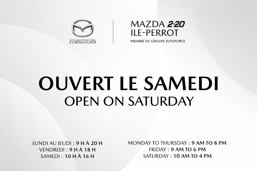 Apple Carplay et Android auto sur tout les modèles MAZDA 2019 et plus. Toit ouvrant, bancs en cuir chauffant, siège chauffeur électrique, caméra de recul, écran multimédia, système de son BOSE, mirroirs chauffants, jantes en alliage, bluetooth, entrées AUX & USB, heads up display, push to start, air climatisé, contrôles de climat deux zones, groupe électrique TAUX D’INTÉRET AVANTAGEUX À PARTIR DE 3.7% GARANTIE 7 ANS OU 140000 KM AVEC L’AJOUT DE LA CERTIFICATION * DÉTAILS EN CONCESSION * Inspecté par nos techniciens certifiés Concessionnaire Mazda Certifié à L'Ile-Perrot membre du Groupe AUTOFORCE, vaste choix de véhicules d'occasion à vendre. Le meilleur prix d'auto usagé de la région de Montréal - Pointe-Claire - Dollard-Des-Ormeaux - Pierrefonds - Roxboro - Kirkland - Beaconsfield - Baie D'Urfé –Senneville - Sainte-Anne-de-Bellevue - Dorval - Longueuil - Ville St-Laurent - Lachine - Lasalle - Saint-Lazare - Vaudreuil - Dorion - Brossard - Chateauguay - Mercier - Rigaud - Les Cèdres - Valleyfield - Coteau-du-Lac - Les Coteaux - Saint-Zotique - Hudson - Pincourt - Ile-Perrot - Saint-Polycarpe - St-Clet. Situé sur l'autoroute 20 à 25 minutes du centre-ville de Montréal et à 12 minutes de l'aéroport de Montréal (YUL). Balance de la garantie mileage illimitée Mazda terminant en 10/2027 Protection étendue disponible avec l'ajout de la CERTIFICATION, détails chez Mazda 2-20* 7 ans de garantie disponible à partir de la date de mise en service du véhicule avec l'ajout de la certification.