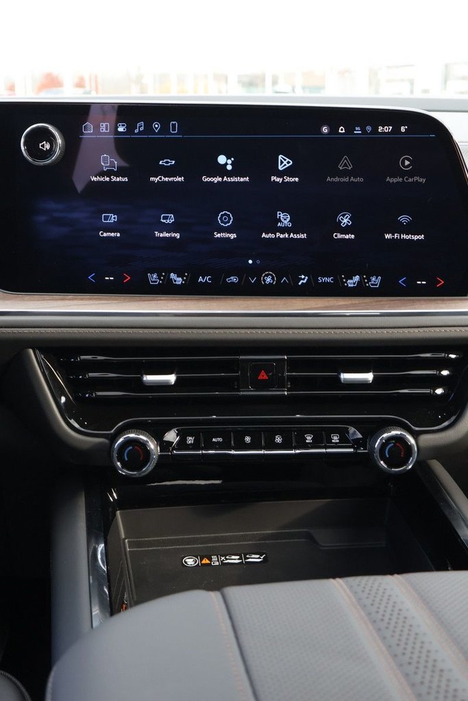 Serrures de porte à commande électrique programmable avec protection antiverrouillage et verrouillage temporisé,StabiliTrak système de contrôle de la stabilité avec aide au freinage et traction asservie,Aide au démarrage en pente,Système sonore à écran ACL couleur évolué de 17 7 po en diagonale avec compatibilité avec Google intégrée (Plan de services sélectionné requis des modalités et des restrictions s'appliquent) y compris la navigation les applications connectées les profils personnalisés pour les paramètres de chaque conducteur la reconnaissance vocale naturelle et l'intégration téléphonique,Commandes au volant du système sonore du centralisateur informatique de bord du régulateur de vitesse du bouton d'écart avec le véhicule qui précède de l'alerte de prévention de collision et volant chauffant (si le véhicule en est équipé),Alerte de prévention de collision,Aide au maintien de la voie avec avertisseur de sortie amélioré,Aide au stationnement automatique amélioré,Capteur de présence du passager pour la place d'extrémité avant pour le sac gonflable frontal de la place d'extrémité avant,Régulateur de vitesse adaptatif,Compatible avec le point d'accès sans fil 5G,CarPlay d'Apple sans fil / Android Auto sans fil,Démarreur à distance,Compatible avec point d'accès sans fil,Lave-glace de la caméra arrière,Réglage des sièges électrique en 8 sens côté conducteur,Éclairage intérieur avec plafonnier contacteur de porte côté conducteur et passager avec éclairage d'accueil temporisé éclairage de l'espace utilitaire éclairage d'accueil activé par la poignée de porte ou le télédéverrouillage et liseuses aux première et deuxième rangées,Phares IntelliBeam à phares de route automatiques,Système antivol électrique avec prévention de l'entrée par effraction,Fonction arrêt et démarrage automatiques,Système de surveillance de la pression des pneus auto-apprentissage comprend alerte de gonflage des pneus (ne s’applique pas au pneu de secours),Climatiseur commande automatique de la température à trois zones avec réglages de température individuels pour le conducteur le passager avant et les occupants des sièges arrière,Téléphonie Bluetooth connexion du téléphone cellulaire au système sonore du véhicule,Ouverture sans clé comprend télédéverrouillage longue portée,Climatiseur arrière,Démarrage sans clé bouton-poussoir,Glaces teintées foncées (toutes les glaces à l’exception du pare-brise et des glaces des portes avant qui sont légèrement teintées),Glaces à commande électrique à descente et montée rapides côté passager avant,Glaces verre feuilleté acoustique,Sacs gonflables frontaux pour le conducteur et le passager de la place d'extrémité avant sacs gonflables latéraux montés dans les sièges du conducteur et du passager de la place d'extrémité avant; sac gonflable latéral intérieur monté au siège du conducteur; rideaux gonflables latéraux aux places d'extrémité à toutes les rangées,Essuie-glaces de pare-brise à intermittence automatique,Glaces à commande électrique à descente et à montée rapides côté conducteur,Carénages de rétroviseurs de la couleur de la carrosserie,Désembueur lunette arrière électrique,Freinage automatique en marche arrière,Suspension arrière multibras avec ressorts hélicoïdaux,Commande du moteur interrupteur de désactivation du système marche/arrét automatique non verrouillable,Guidage de l'attelage,Fonctions de base OnStar (fonctions de base OnStar pour parc),Freins à disque aux quatre roues avec système antiblocageavec disques DURALIFE,Refroidissement refroidisseur d’huile de transmission auxiliaire par air de grande capacité,Ports USB 2 de types A et C recharge et données situés sur la console avant,PNBV 3 493 kg (7 700 lb),Pneu de secours P265/70R17 toutes saisons à flanc noir,Serrures de porte de sécurité à l'épreuve des enfants aux portes arrière manuel,Suspension ressort hélicoïdal concentrique à l'amortisseur à l'avant avec barre stabilisatrice,Vision périphérique haute définition,Alerte de cycliste sur le côté,Système de gestion du chargement,Ports USB 2 de type C de recharge seulement situés dans la troisième rangée,Avertisseurs sonores les phares allumés la ceinture de sécurité non bouclée côtés conducteur et passager avant droit et le clignotant activé,Rappel de vérification des sièges arrière,Colonne de direction verrouillage électrique,Pont arrière rapport de pont de 3 23,Brancards pour porte-bagages brillant monté sur le toit,SiriusXM avec plateforme 360L Abonnement d'essai. SiriusXM avec 360L transforme les déplacements de vos clients gràce à notre expérience radio la plus complète et la plus personnalisée sur la route,Tapis protecteurs garnis de moquette de couleur assortie aux première et deuxième rangées amovibles,Freinage d'urgence automatique dans les intersections alerte aux intersections freinage,Centralisateur informatique de bord écran numérique couleur de 11 po en diagonale,Différentiel mécanique à glissement limité,Contrôle de filtration de l'air du moteur,Pare-soleil miroirs de courtoisie éclairés côtés conducteur et passager avant coulissants,Revêtement de plancher moquette de couleur assortie,Marchepieds noir avec bande décorative chromée,Freinage de détection des piétons et des cyclistes à l'avant,Alerte de détection de piétons à l'arrière,Compatible avec les services OnStar,Volant à 3 rayons gainé,Cric mécanique avec outils,Prises de courant 2 120 volts situé à l’arrière de la console centrale et de l’espace utilitaire,Glaces à commande électrique avec descente rapide à l'arrière,Fonction ado,Porte-roue de secours extérieur verrouillable de type à manivelle sous le châssis à l’arrière,Poignées de maintien montant avant et montant milieu aux places d’extrémité de la deuxième rangée,Freinage d'urgence automati